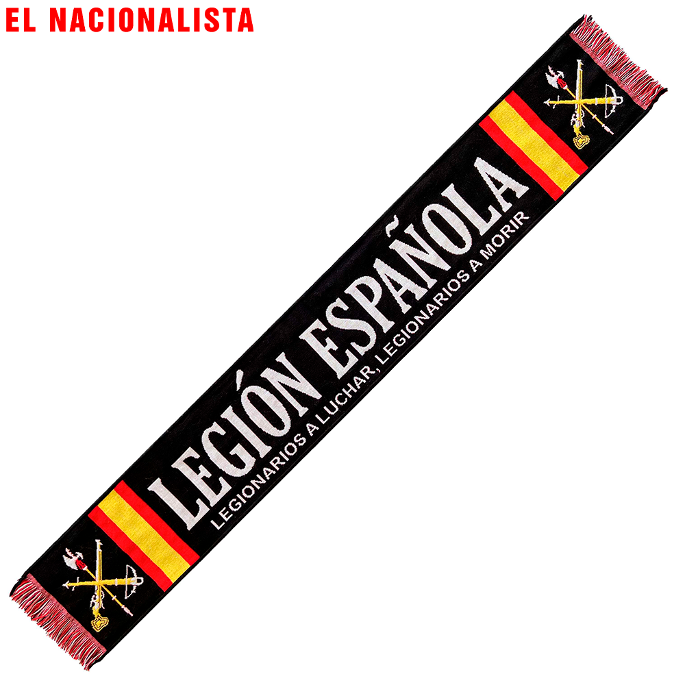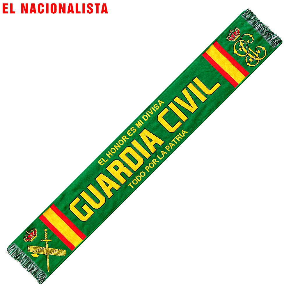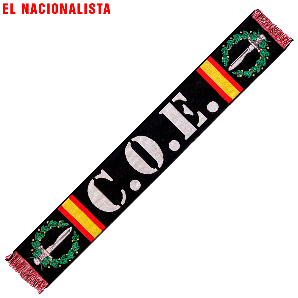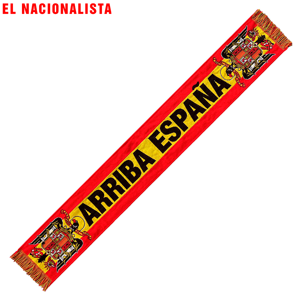 Bufandas con los colores de la bandera de España, escudos clásicos y lemas patrióticos.