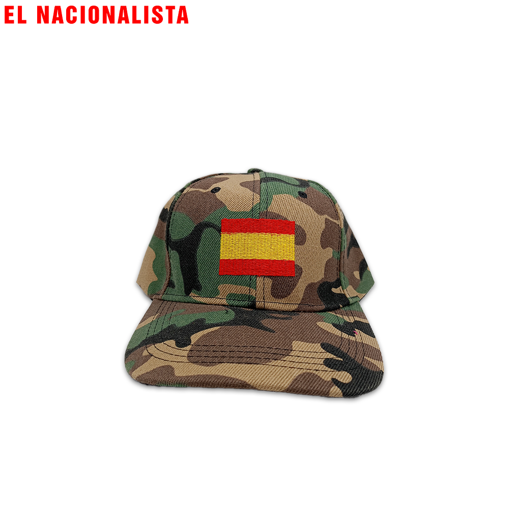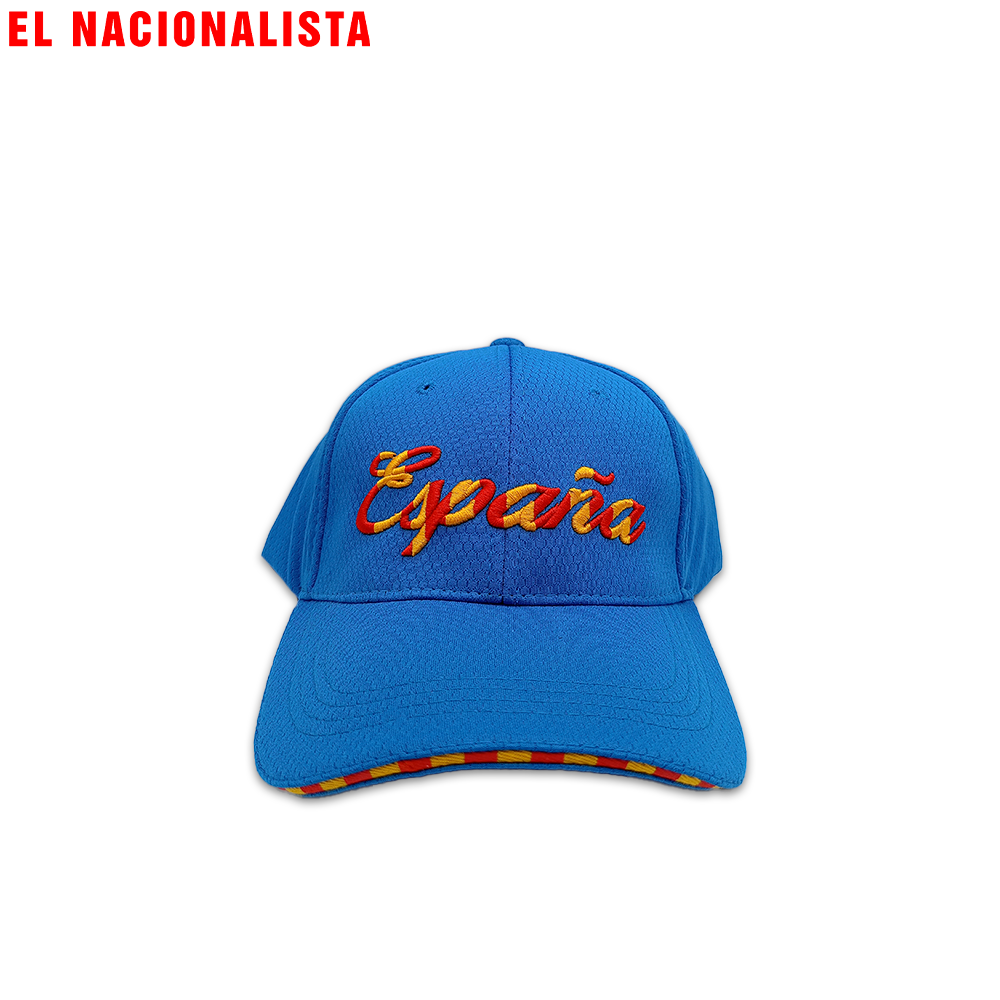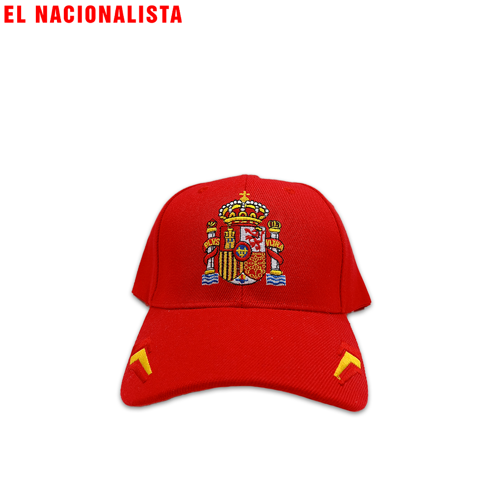 Gorras con la bandera nacional, escudos históricos, frases emblemáticas y detalles en rojo y gualda.