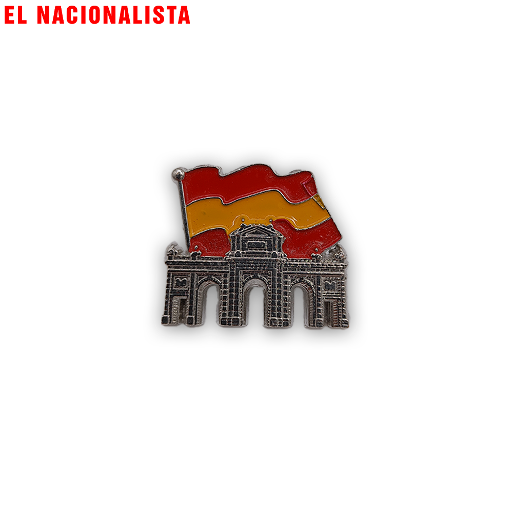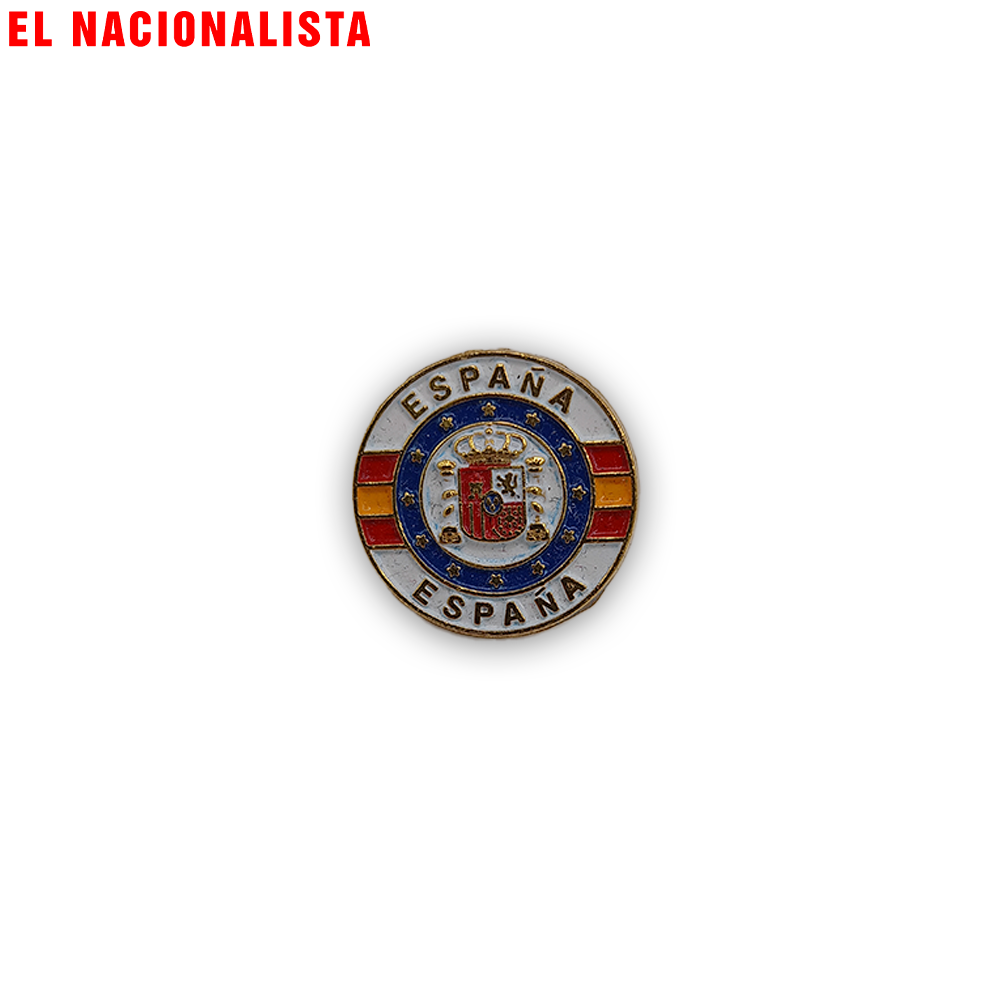 Pines que incorporan la bandera española, escudos históricos y otros iconos patrióticos reconocidos.