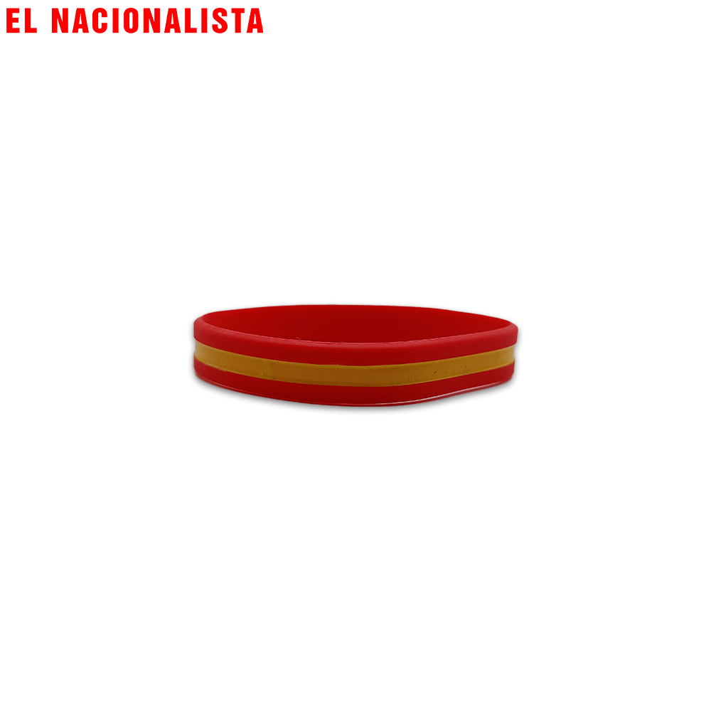 Pulseras con la bandera de España, escudos emblemáticos y elementos patrióticos.