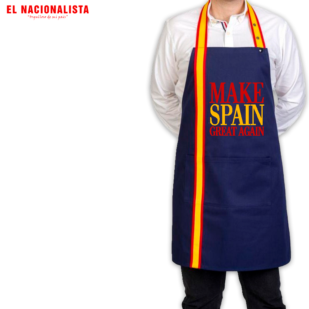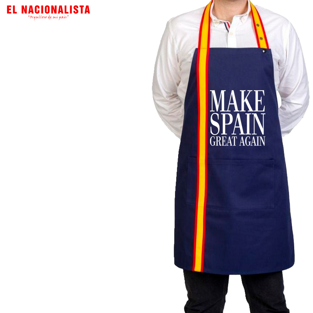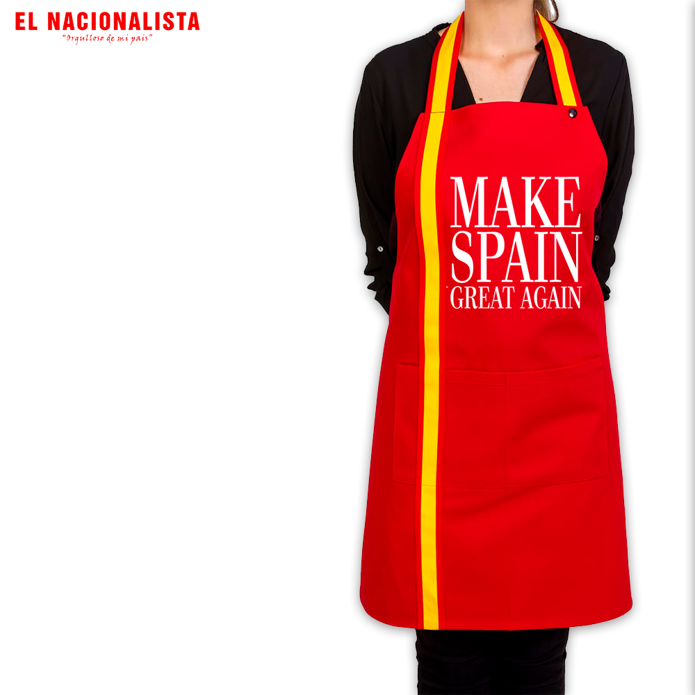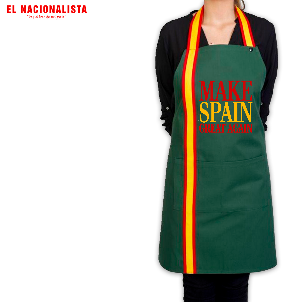Delantal práctico y resistente ideal para cocinar, trabajar o realizar actividades diarias, con un diseño llamativo que presenta el texto “Make Spain Great Again” sobre un fondo de colores variados.