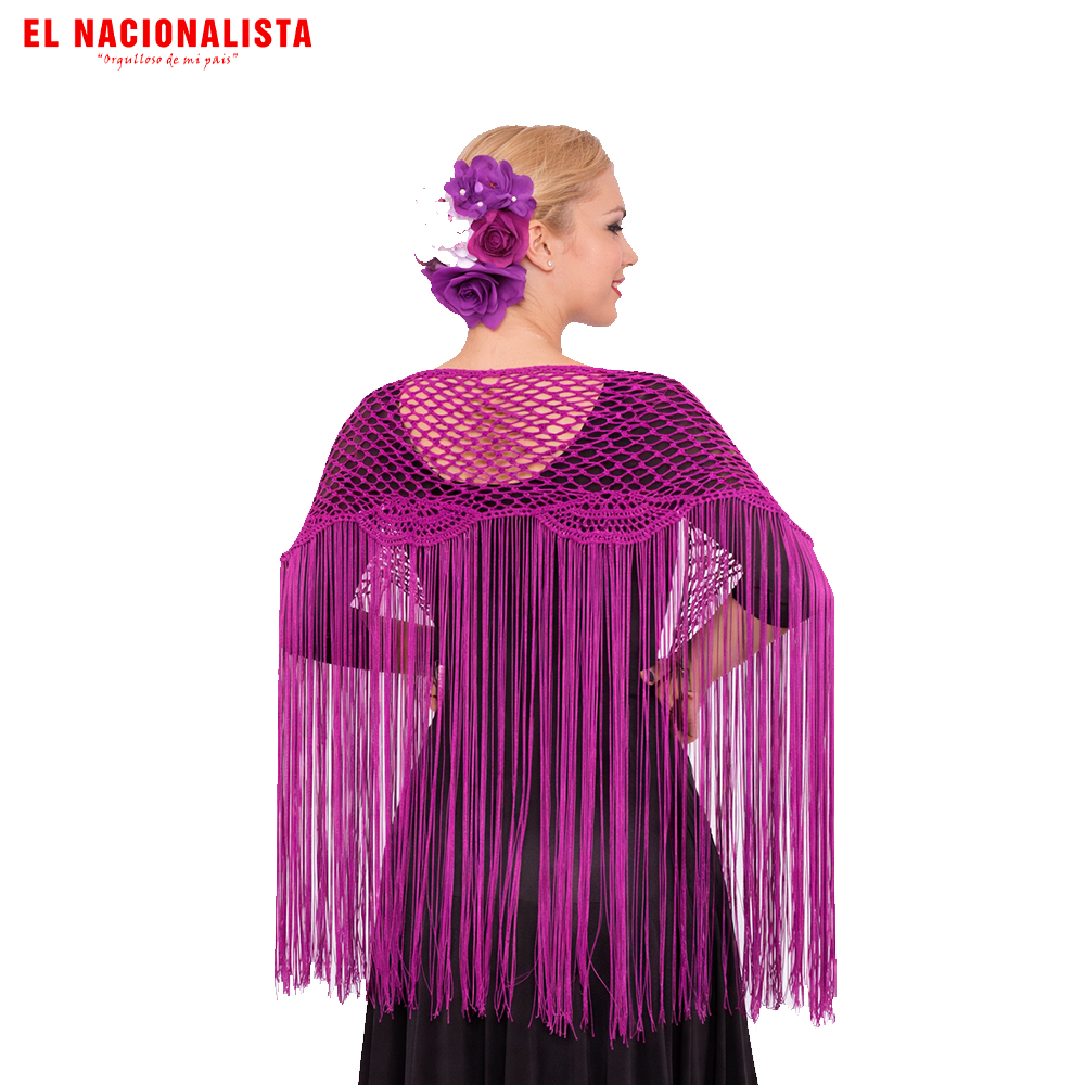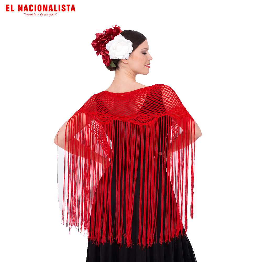 Mantón de flamenco en color rojo granate con acabado de flecos largos y tejido calado. Un complemento clásico que aporta movimiento, estilo y presencia en cualquier look flamenco.